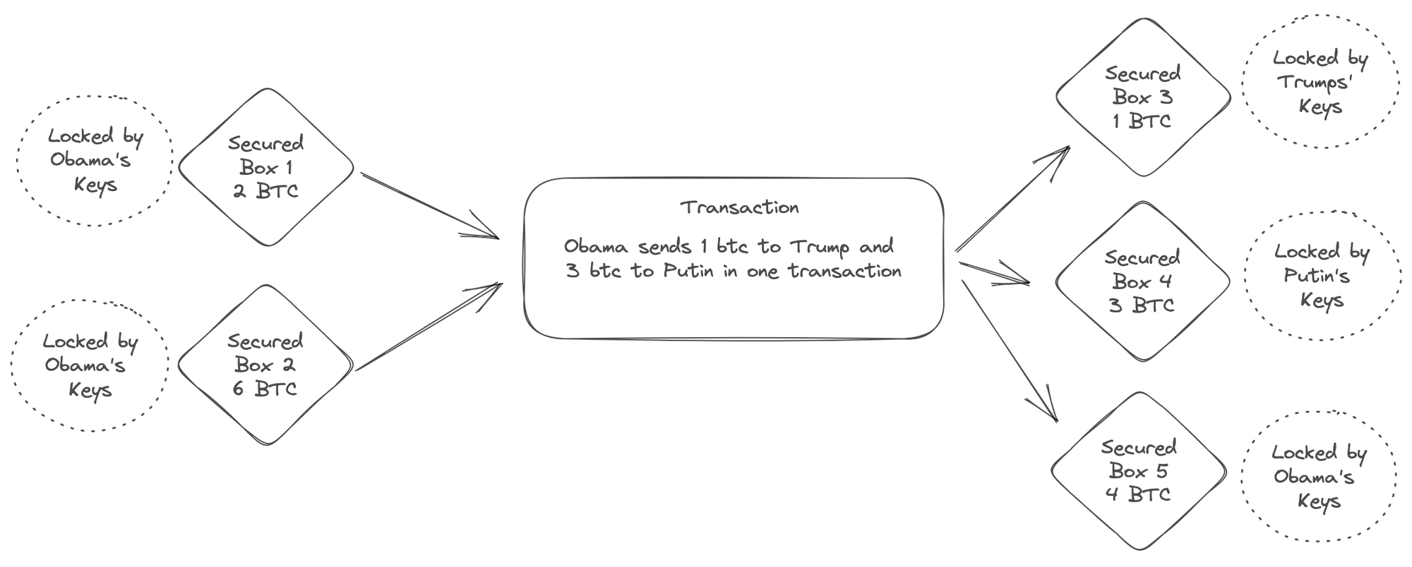 The UTXO model adopted by Bitcoin maintains a global registry of transactions. Each transaction consumes and produces “boxes” of secure state (e.g. satoshi values) that can only be controlled by an account holder’s private keys. Each account has many such boxes at any time, resulting from previous transactions. Think of it as your spare change scattered around in many places.
