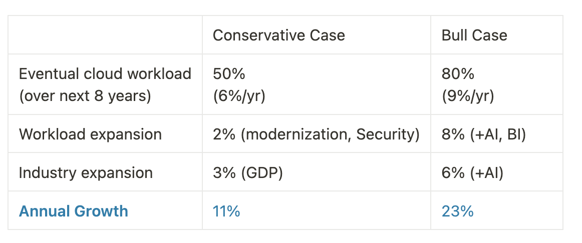 The conservative case assumes cloud costs will limit adoption to 50% of the workloads. There will be a pricing pressure, but offset by existing-workload-expansion. Overall, Hyperscaler growth rates will come down substantially over next 5 years.