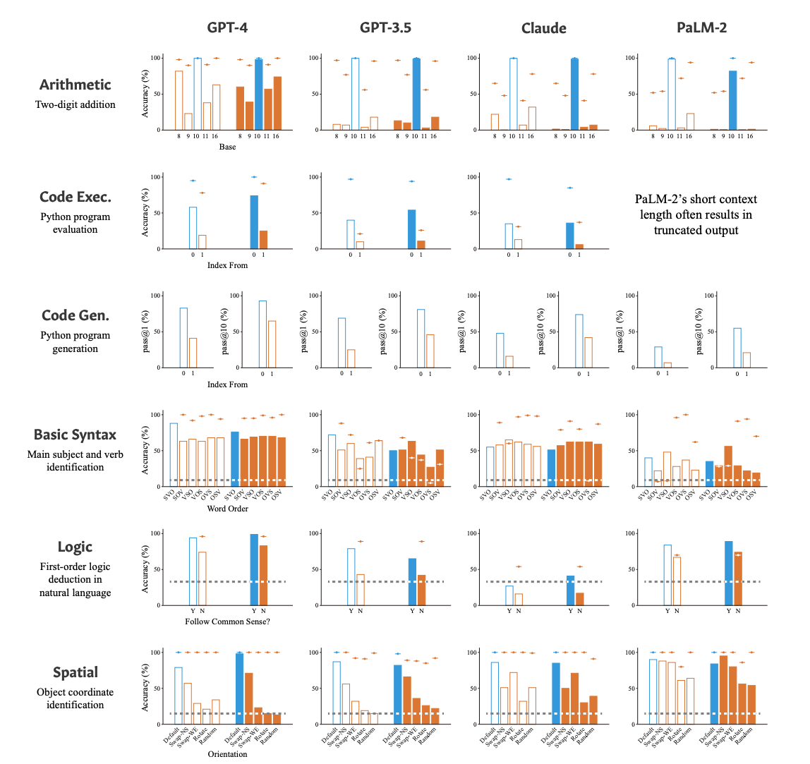 - GPT-4 is significantly better than 3.5, Claude, Palm-2 at abstract reasoning.