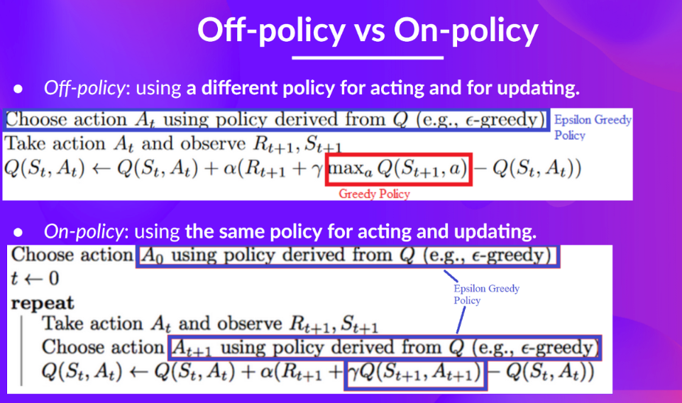 - On policy, off policy: on-policy means stick to the same algorithm for entire episode. Off-policy means keep updating the policy algorithm.