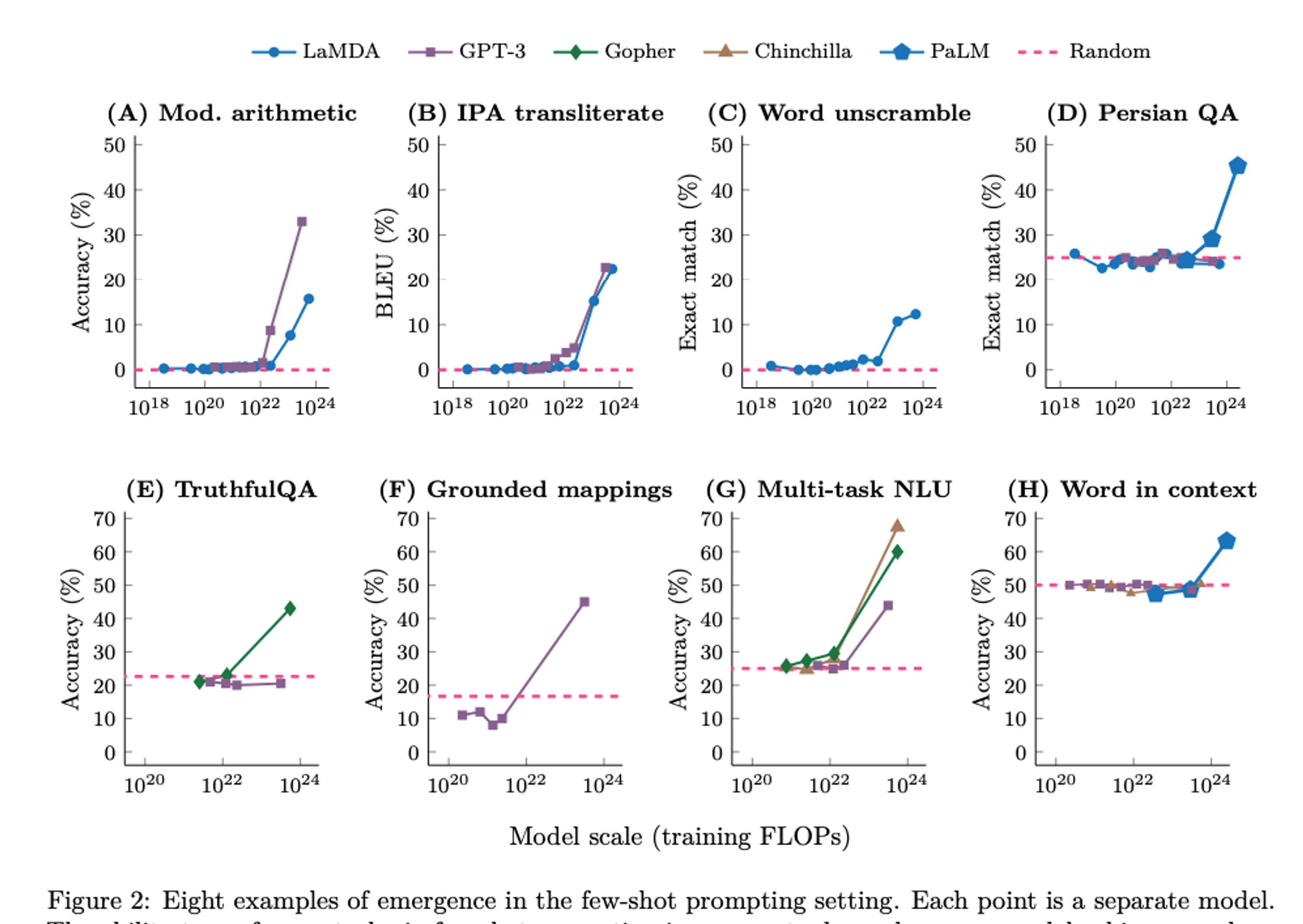 We used to see linear improvements with scale (of data, parameters/architecture, training epochs) against benchmark tasks. But what we are finding across multiple large scale models is that there is an inflection point at which the accuracy curve improves significantly and our earlier extrapolations for LLM’s abilities don’t apply.